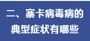 大多數寨卡病毒患者不會出現癥狀。約20%有臨床癥狀,通常有發熱(多為中低度發熱)、皮疹(多為斑丘疹)、結膜炎(非化膿性)、肌痛、關節痛、全身乏力、頭痛等,病程持續2-7天緩解。